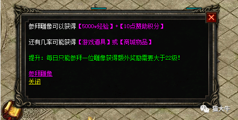 这次咱们的参拜雕像做得非常的人性化了,这告诉我们打不过咱就加入,如果不能拿到第一的称号,参拜以后可以获得很高的经验,还有几率获得道具呢~不过每天只能参拜一位,大牛已经准备好被参拜了,快来吧!别客气!有经验咱一起领~