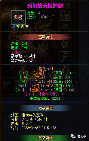 这面板一看就知道不简单吧,金木水火土都是有满值的,强化是随机取中间值,这就要看脸了啊,如果追求更高的品质的朋友可以去三大陆继续洗炼,当然了,这都是后话了,这里五行属性的数值大家要注意一下,不要只盯着魔次,后面有很多图是对五行属性有硬性要求的,没有达到依然不让进~