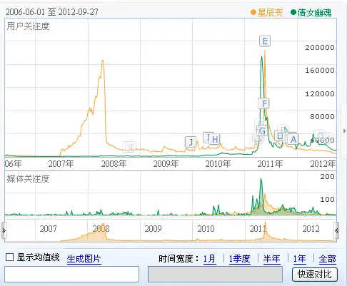 上表是盛大的星辰变和网易的倩女幽魂用户关注度和媒体关注度的百度指数,由于这两个游戏有很强的相似性,所以很能说明问题 两者都是在11年进行了大规模的宣传,然后在接下来的一年里发生了很有趣的情况,网易还继续在给倩女幽魂投入资源,而盛大的星辰变呢?大家自己看吧。