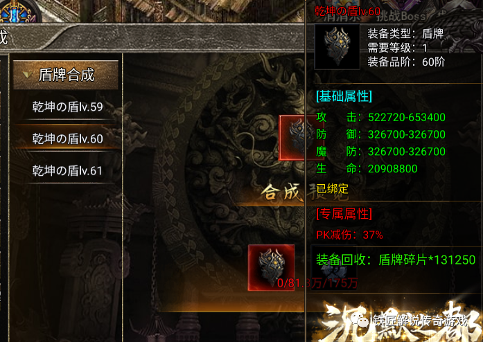 一、盾牌的属性我本沉默中的盾牌主要就是用于pk减伤,如图中所示盾牌的基础属性攻击:487840-609800防御:304900-304900魔防:304900-304900生命:19513600专属属性: